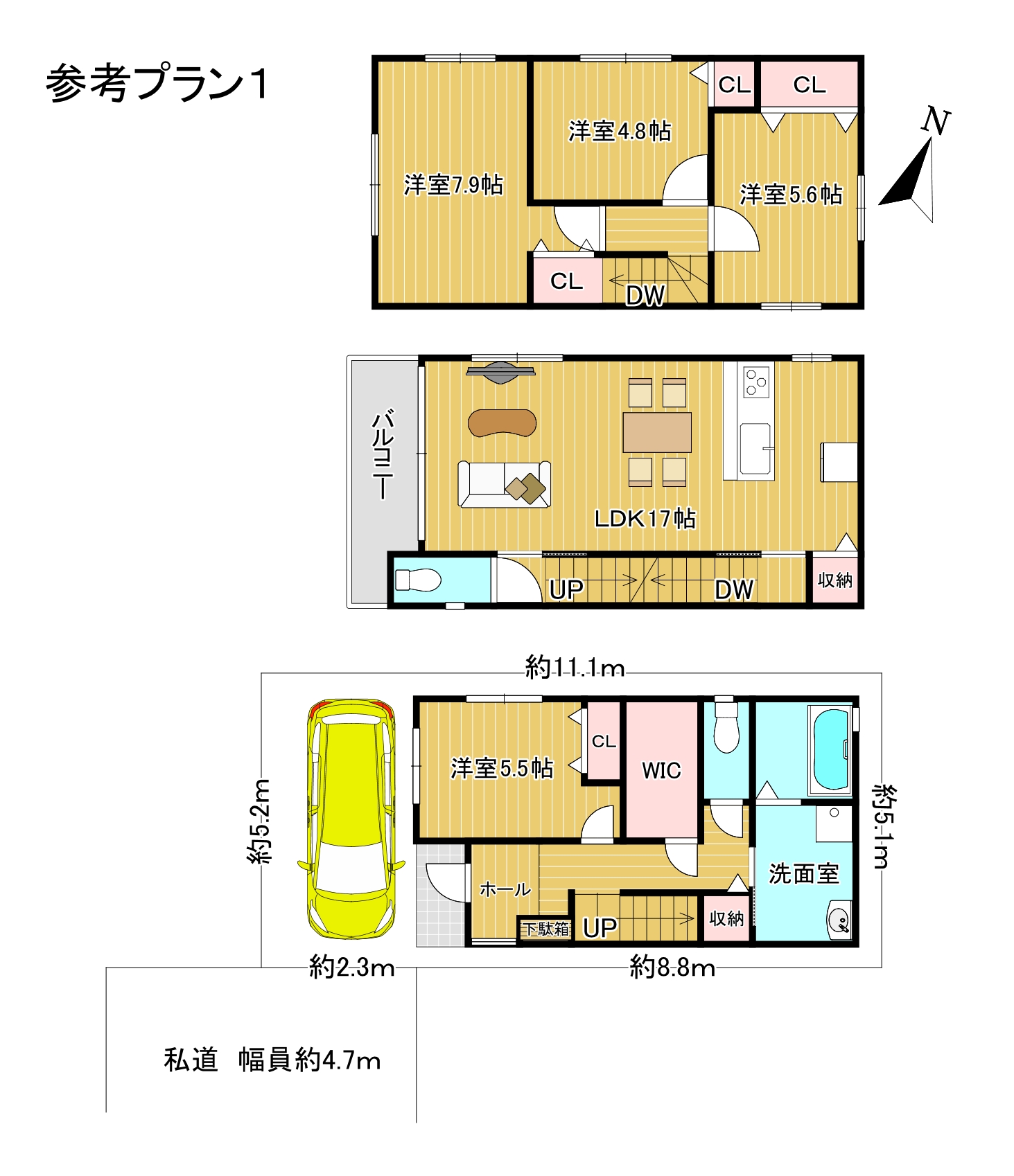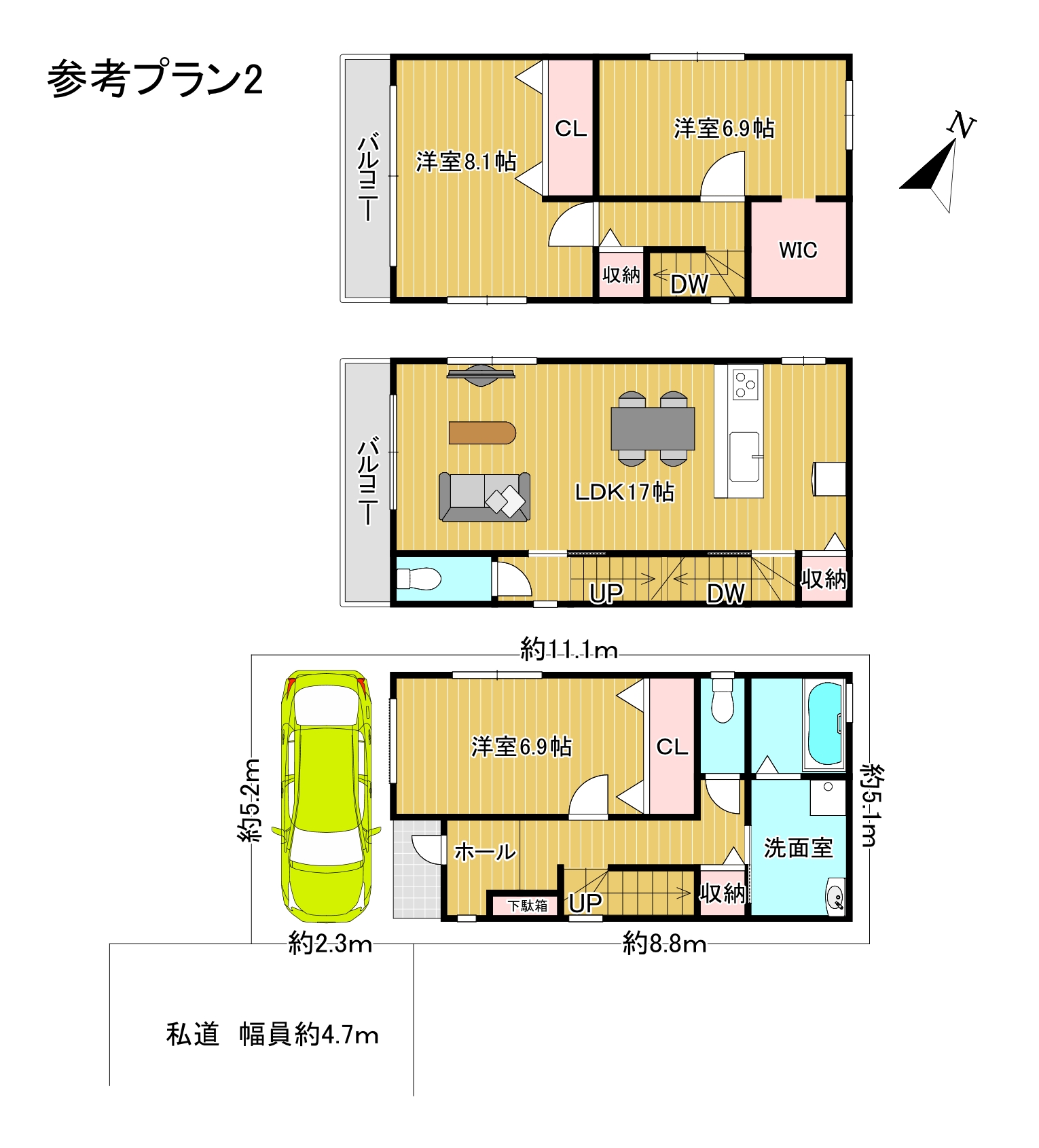 | 接 道 | 一方 南側 私道 幅員約4.7m 北側 私道 幅員約4.0m |